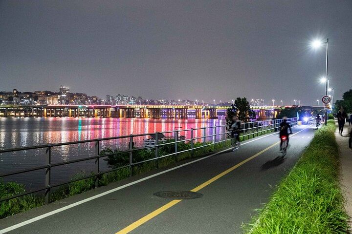 Cycle alongside the serene Hangang River on this evening bike tour, starting from Yeouinaru Station. Feel the gentle riverside breeze as you ride through Yeouido Hangang Park and marvel at the enchanting Rainbow Fountain Show at Banpo Bridge. Take in the stunning nightscape from Jamsu Bridge and discover Nodeul Island, a hidden gem perfect for panoramic photography. Along the way, share in a classic Korean riverside snack of ramyeon — the perfect touch to your scenic journey.
